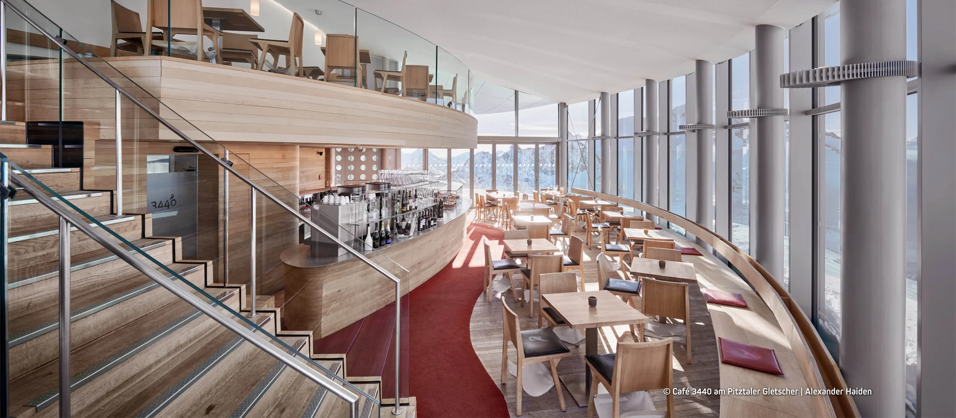 Das Café 3440 thront spektakulär über den Wolken und bietet eine atemberaubende 360-Grad-Aussicht auf die umliegende Gletscherwelt, darunter die markanten Gipfel der Wildspitze, Tirols höchstem Berg. Die moderne Glasarchitektur des Cafés ermöglicht eine uneingeschränkte Sicht auf die schneebedeckten Berge, während im Inneren ein stilvolles Ambiente zum Verweilen einlädt.
